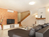 La casa de vacaciones Villa Paris III consta de dos plantas. En la planta baja hay un salón grande y espacioso con sofá, TV, chimenea, mesa de comedor y cocina totalmente equipada.