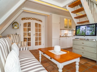 Desde el vestíbulo se accede al baño con ducha. Un acogedor salón/comedor se encuentra también en el primer nivel, así como la cocina americana completamente equipada con cocina de inducción, lavavajillas y lavasecadora. A través de...