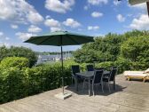 Una hermosa vista del Schlei por la mañana desde la terraza, veleros en el pequeño embarcadero y mucha naturaleza verde en verano le esperan cada vez que comience un nuevo día en la casa de vacaciones...